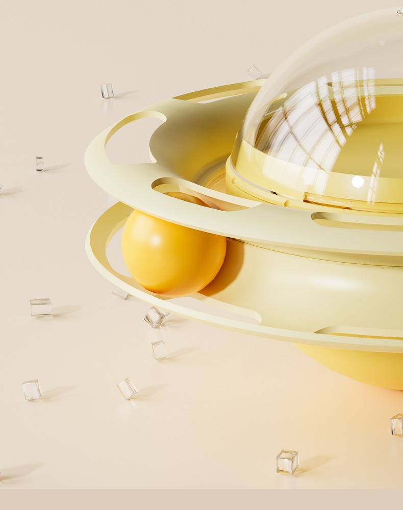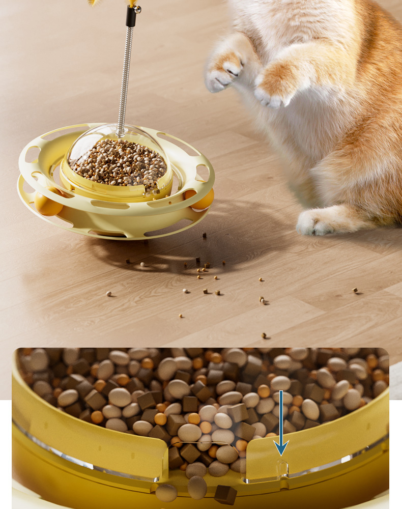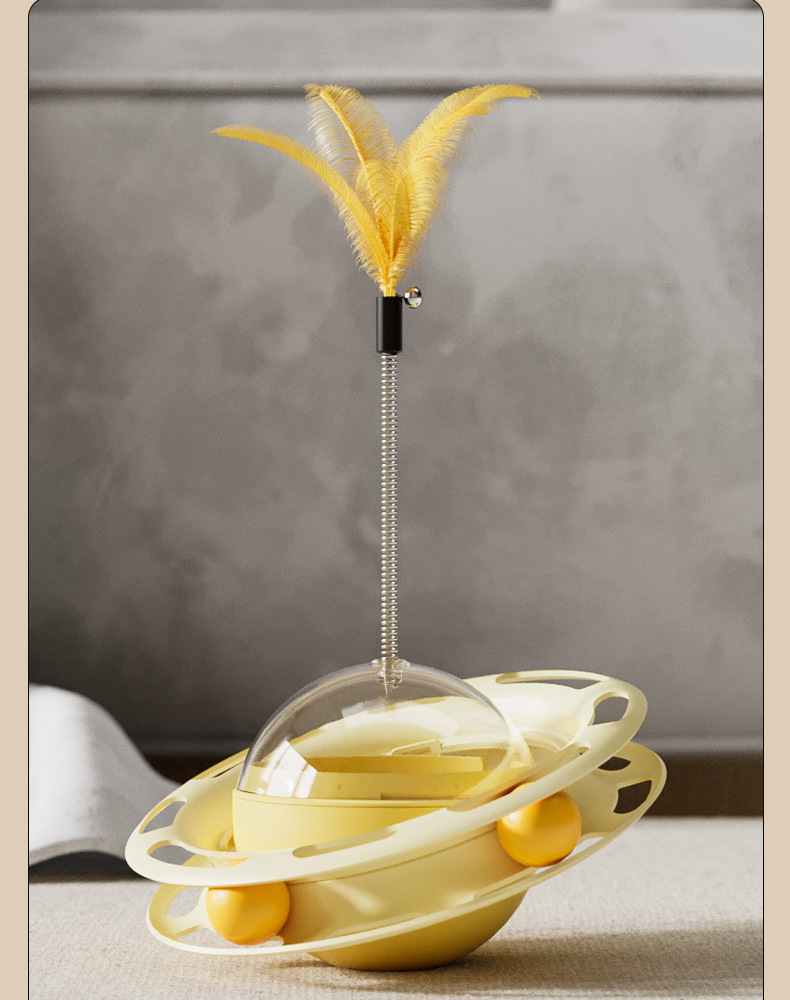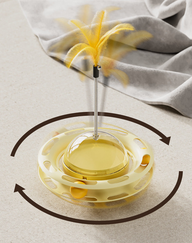 Interactive Design: Self-spinning turntable with feather attachments engages cats through motion and sound.