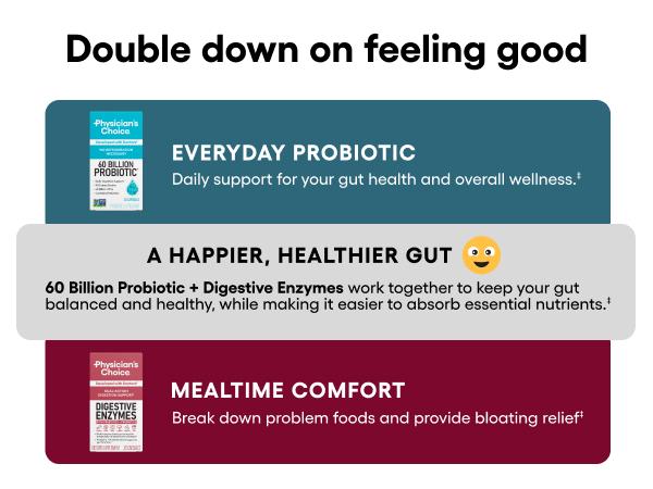 Physician's Choice Hack Your Tummy Bundle combines 60 Billion Probiotic and Digestive Enzymes for ultimate daily digestive and mealtime discomfort support.